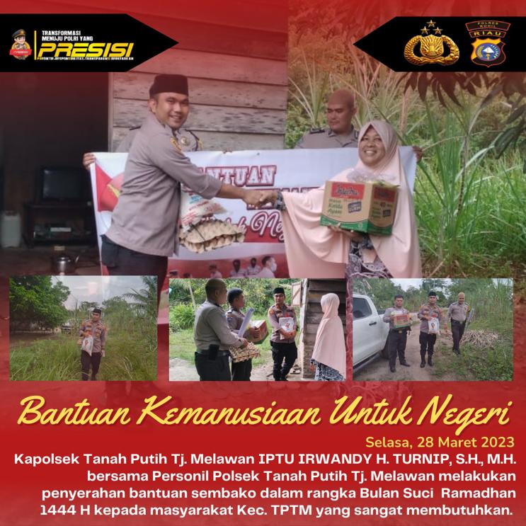 Tanah Putih Tanjung Melawan (suarapesisirrokan.com) Polsek Tanah Putih Tanjung Melawan ( TPTM) Polres Rokan Hilir bagikan Bantuan Sosial (Bansos) kepada warga tidak mampu di wilayah Kecamatan Tanah Putih Tanjung Melawan, Selasa sore (28/3/2023).