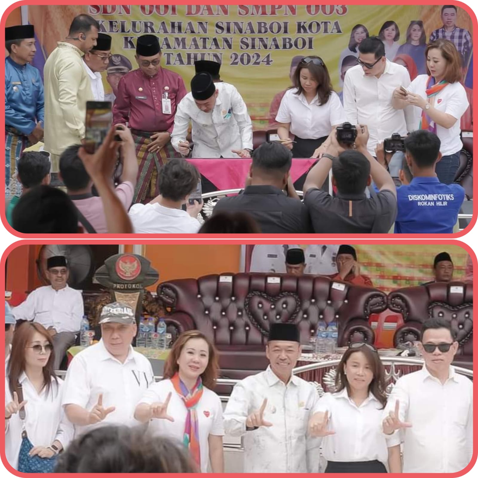 Sinaboi – (suarapesisirrokan.com) Bupati Kabupaten Rokan Hilir (Rohil) Afrizal Sintong bersama para donatur menghadiri peresmian ruang sekolah SDN 001 dan SMPN 003 yang berada di Kelurahan Sinaboi Kota, Kecamatan Sinaboi, Jumat (28/6/2024) sore.