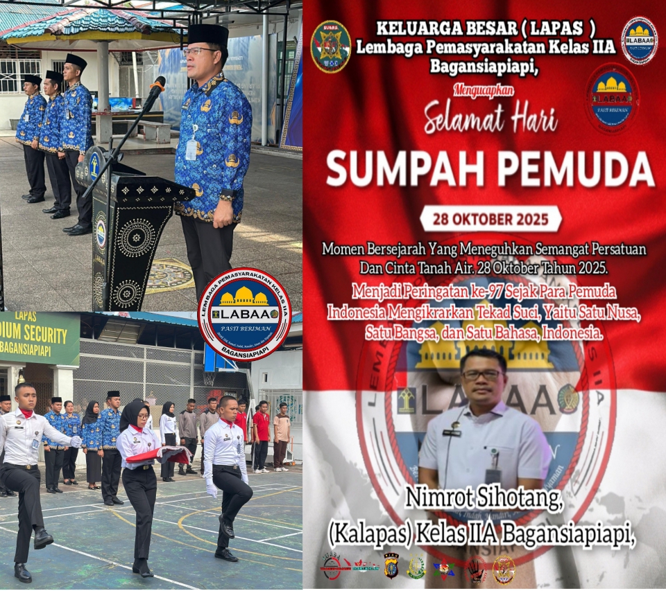 Bagansiapiapi – (suarapesisirrokan.com) Senin pagi, 28 Oktober 2025. Dalam rangka memperingati Hari Sumpah Pemuda ke-97 tahun 2025, Lembaga Pemasyarakatan (Lapas) Kelas IIA Bagansiapiapi melaksanakan upacara bendera di lapangan Utama Lapas,