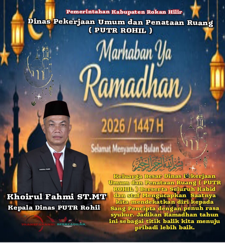 Khoirul Fahmi ST.MT Bersama Keluarga Besar Dinas Pekerjaan Umum dan Penataan Ruang ( PUTR ROHIL ) Berserta Seluruh Kabid PUPR dan Staf Mengucapkan Selamat menjalankan ibadah puasa untuk seluruh jajaran di pemerintahan kabupaten Rokan hilir dan masyarakat yang merayakan dengan gembira. Rabu, 18/02/2026